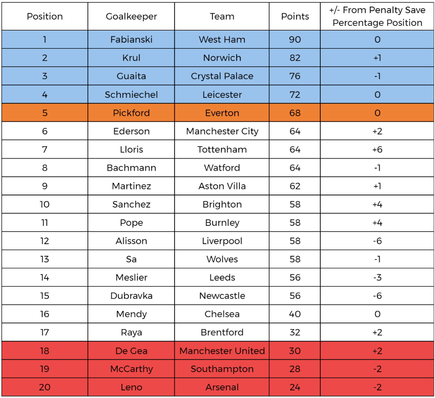 Fabianski won the most penalty shootouts racking up 90 points, which is driven by his penalty save percentage being the highest in the league. The three relegated sides are Manchester United, Southampton and Arsenal. This is interesting as Bernd Leno and David De Gea are two of the best open-play shot-stoppers in the league. This means their problem is reading penalty-takers, not the actual saving if they go the right direction. All the newly promoted sides stay up in this format, with Krul and Norwich finishing second in the league. Krul is acknowledged as one of the best penalty savers in the league. He is well known for being subbed on for the penalty shootout against Costa Rica in the 2014 World Cup, saving 2 penalties and winning the game for the Netherlands.