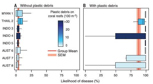 This can be shown in Figure 1, where all coral sites show a much greater probability of disease with plastic debris compared to the control. This is due to the plastics encouraging microbial colonisation and increasing the number of pathogens that live on the reef. Corals have a much lesser chance of surviving their early stages with more diseases present.